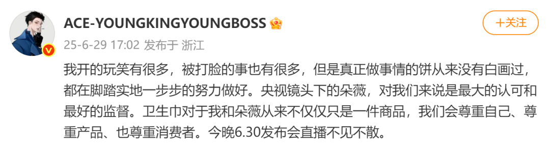 黄子韬还在微博回应央视探访:“我平时玩笑多,也有过被打脸的事,但做事从不说空话,都在脚踏实地推进。央视镜头下的朵薇,是对我们最大的认可和监督。卫生巾对我和品牌来说不只是商品,我们会尊重自己、尊重产品,更尊重消费者。”