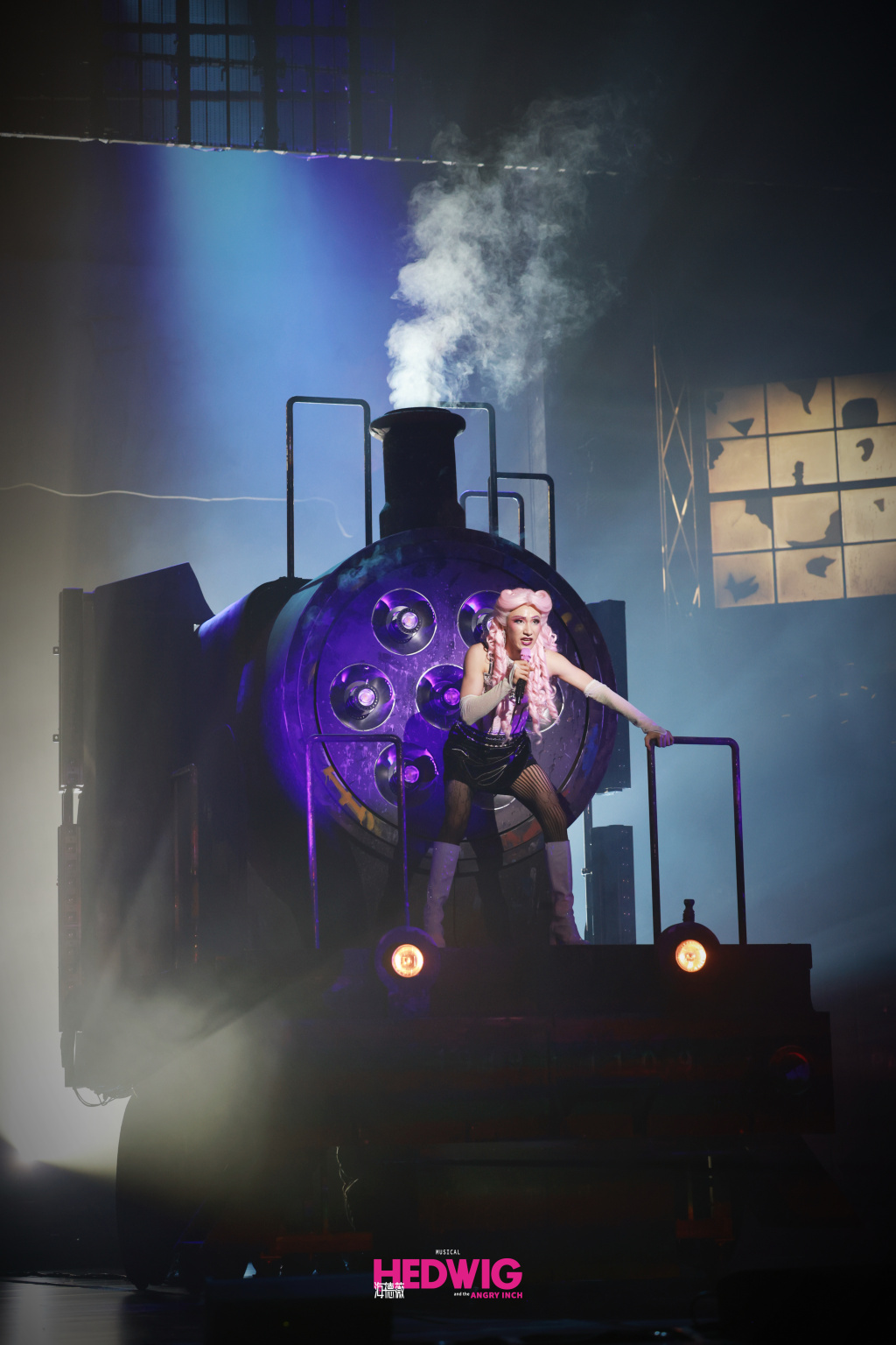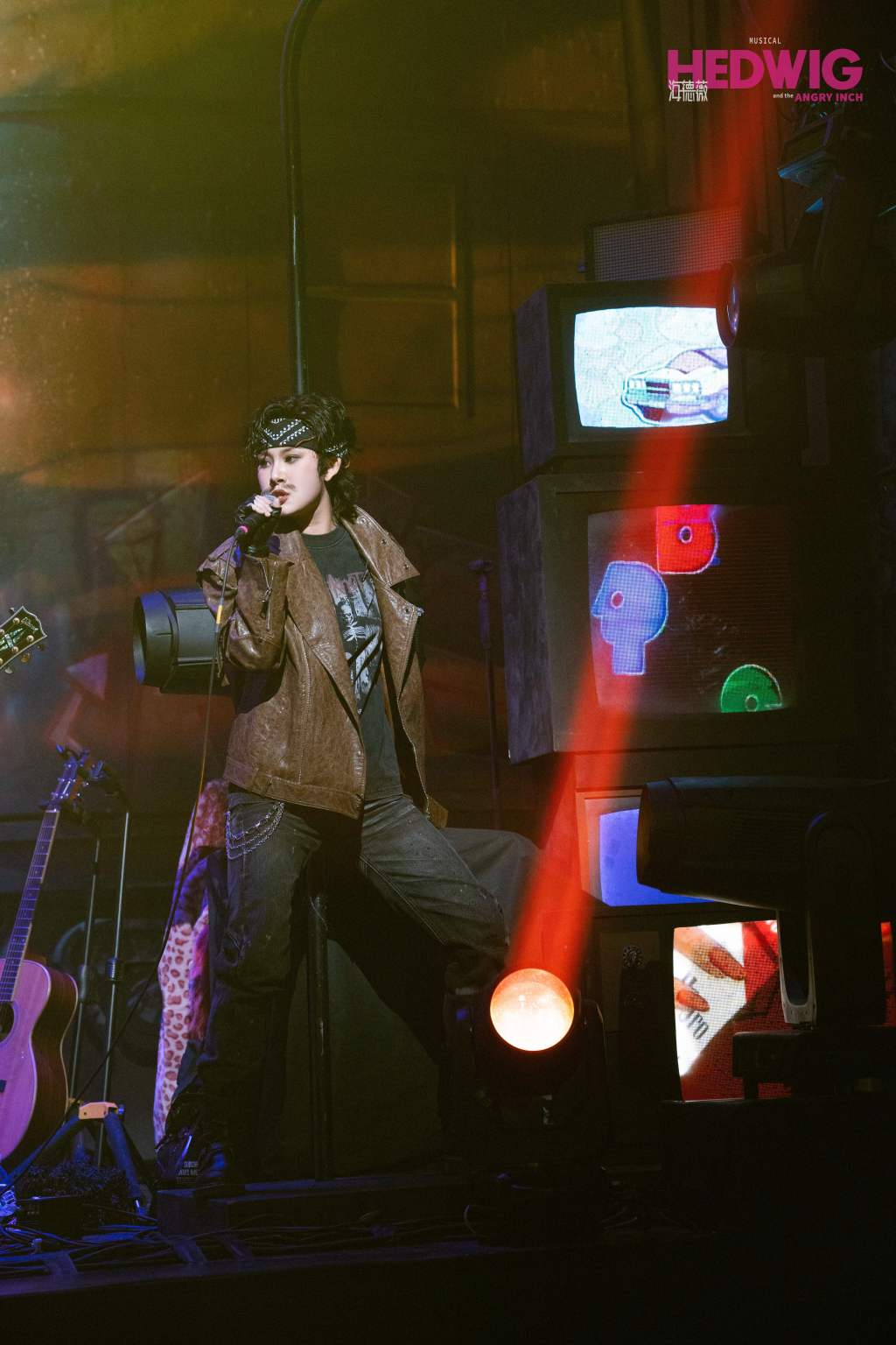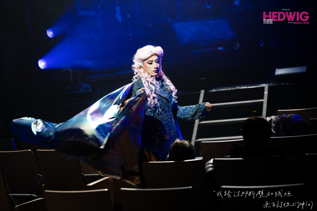 海德薇登场时,顶着标志性猫头鹰造型的硕大银色假发,从观众席缓步上前,身影全程由舞台电视屏幕转播,观众能清晰看到她的亮片造型细节。这并非传统戏剧角色的出场方式,更像流行巨星的登场,互动让音乐剧趋近真实摇滚现场,最后观众甚至能起身随节拍律动,将剧院变成livehouse。