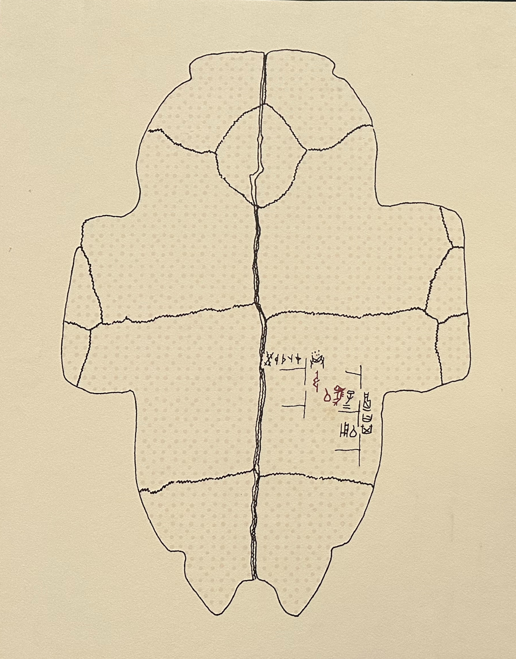 这是商王武丁时期的完整龟腹甲,长21.8厘米、宽15.4厘米,现藏中国社科院考古研究所。甲片正面有一条占卜记录,记述“子”卜问贵族子发贡纳马匹之事。“发以马”三字可参照示意图寻找,涂红的三个字从左至右即为“发以马”。