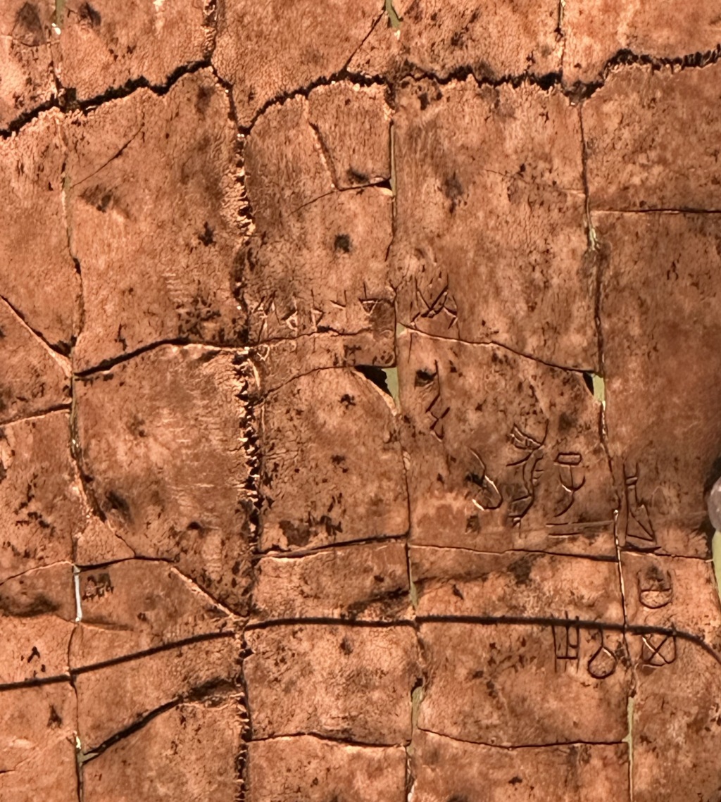 “发以马”甲局部放大,参照前两图,可清晰看到卜甲上的甲骨文“马”字。殷墟博物馆展陈