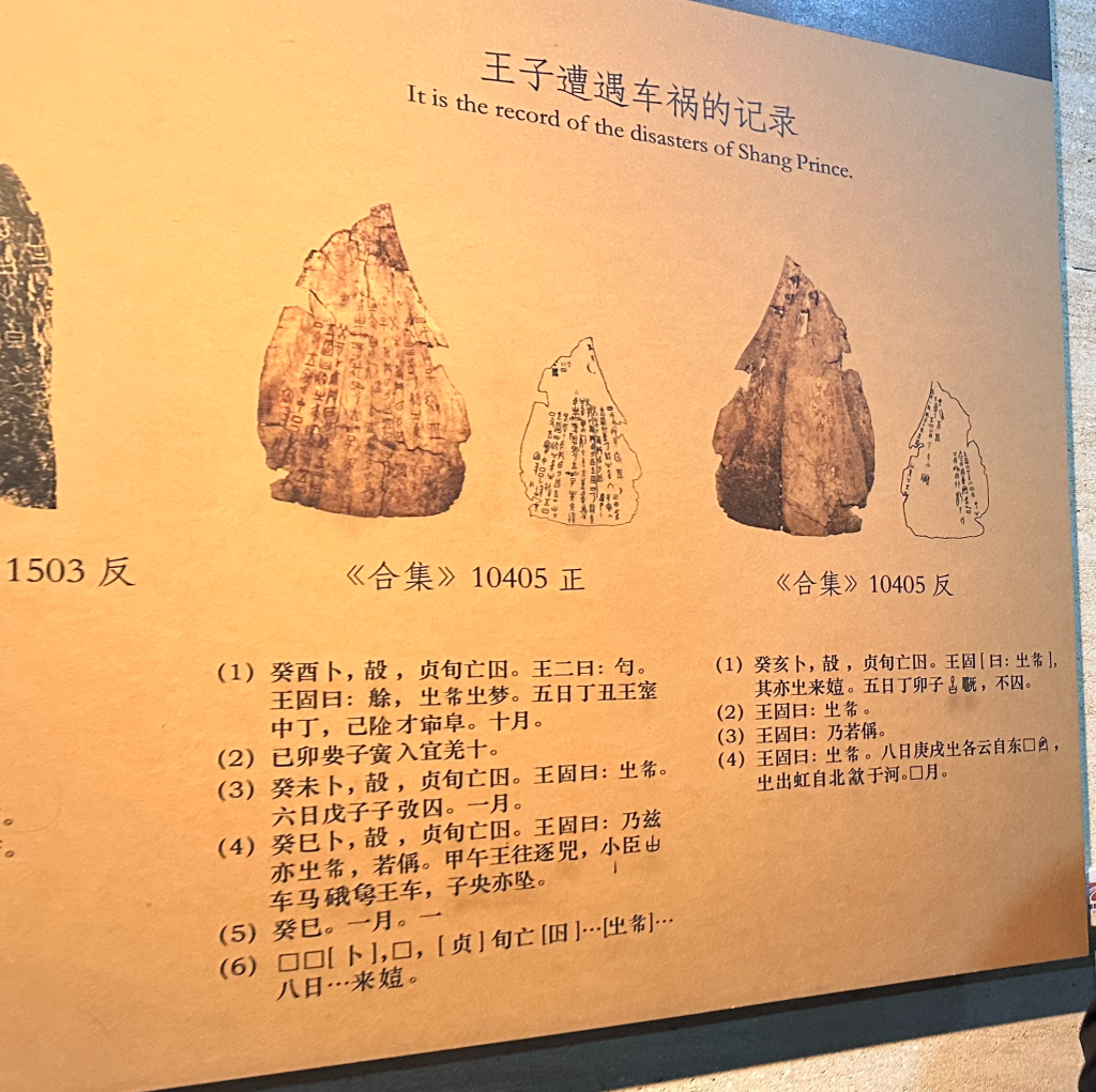 甲骨文中记录的一次车(马)祸,见图中第4条文字说明。安阳中国文字博物馆展陈