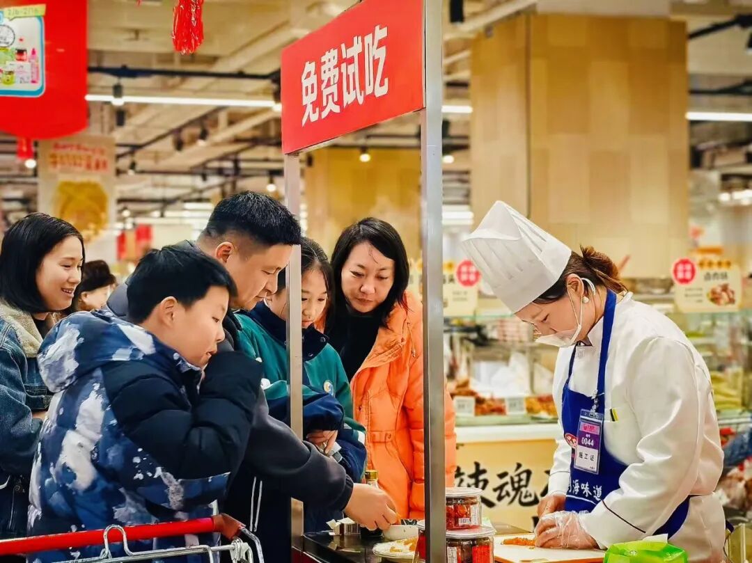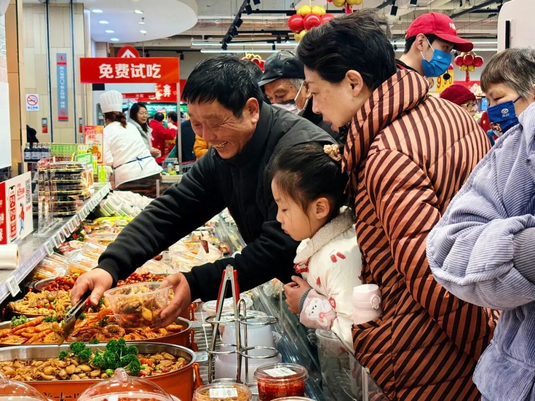 吾悦广场店最突出的是现制熟食与加工档口的高密度布局:烤类、炸类、卤酱、煎烙、糖水、蒸煮等档口一应俱全,还引入非遗老字号文虎酱鸭、嘉兴文虎盐水草鸡、扬州盐水鹅、德御斋桃酥等特色小吃,均为现制现售热食。这一配置精准对接双职工“省时”、家庭餐“高效”、商场客流“即买即食”的需求,将下班带菜、逛街加餐、周末加菜等场景整合于同一动线,提升顾客停留时长与连带消费,使门店从“采购场所”升级为“购物+餐食+体验”复合空间,形成线上履约难以替代的线下价值。