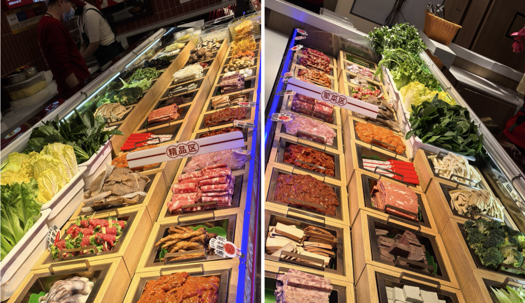 首先是食材真。唐芳将老城口定义为“牛肉冒菜”,把牛肉打造成品牌超级符号。她敏锐捕捉到年轻人对高蛋白、低负担饮食的需求,认为牛肉细分赛道有突围机会。为做好牛肉,老城口采用火锅级食材标准,对牛肉选材严苛到部位、切片大小和厚度,精品牛肉单独称重售卖,确保品质可持续。此外,店里五六十个配菜坚持“不时不食”,展示柜全是当季新鲜食材。