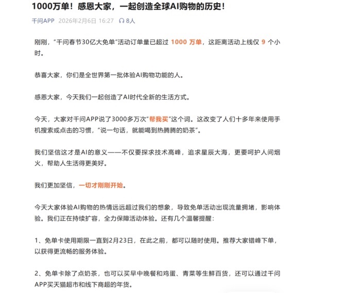 2月6日,你是否顺利通过千问APP完成了下单操作?