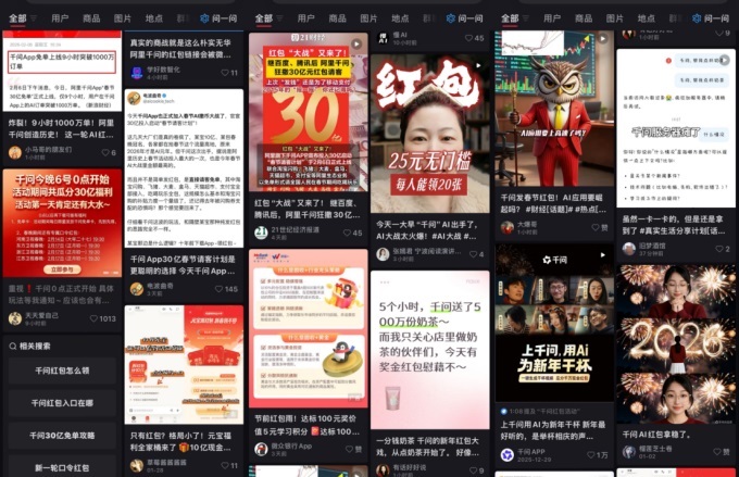 继腾讯元宝推出现金红包活动后,阿里旗下的千问APP于2月6日正式启动“春节30亿大免单”活动,将大模型能力直接融入奶茶、外卖等高频消费场景。