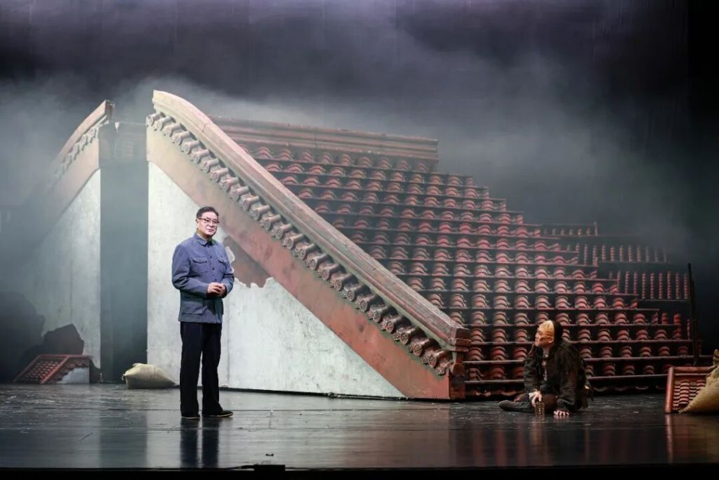 冯远征透露,灵感源于在钟鼓楼上俯瞰北京城的体验——以首善之区独有的屋顶代表这座城市,红色是红墙之色,舞台末尾的黄色琉璃瓦则象征皇家建筑色彩。两种颜色构建出观众“登高望远”的历史凝视点。