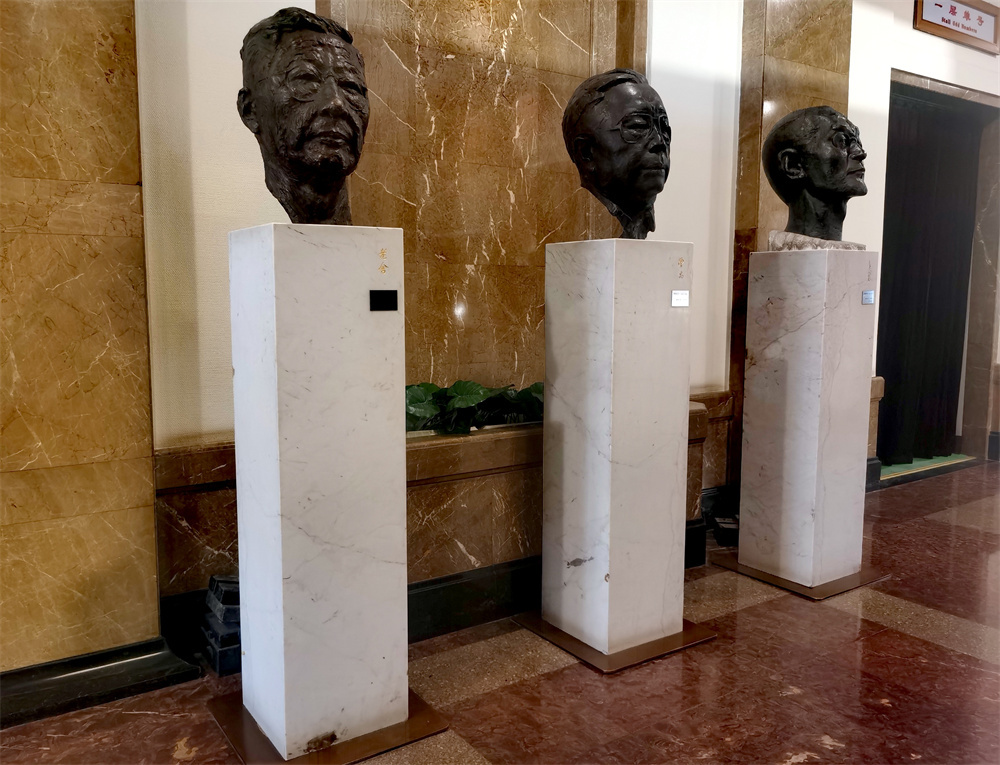 首都剧场大厅内陈列的老舍(左)、曹禺、焦菊隐头像。澎湃新闻记者 王诤 图