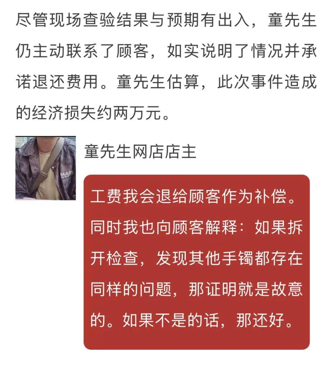 童先生说,得知情况后他立刻联系了委托加工的公司,可对方否认往手镯里塞过钢珠。为了维护店铺的信誉,童先生马上启动了召回程序,把该批次已卖出的9个手镯中的5个召了回来。