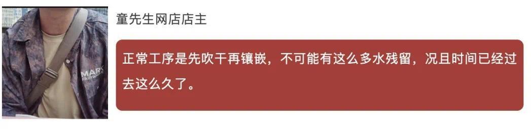 2月6日上午,在记者的见证下,童先生拆开了这5个召回手镯的快递包装,再加上库存里同一批次的2个手镯,一共7个产品进行了现场检查。结果发现,其中2个手镯内部有水迹,但7个手镯里都没找到钢珠。