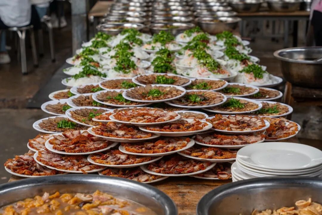 比如散养山林的土鸡做成干蒸土鸡,现捞的水库鱼头,村里阿姨手工灌制的香肠、现包的春卷,还有各地独有的特色小吃。