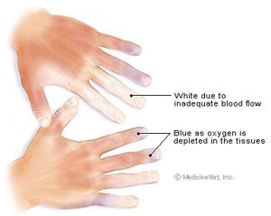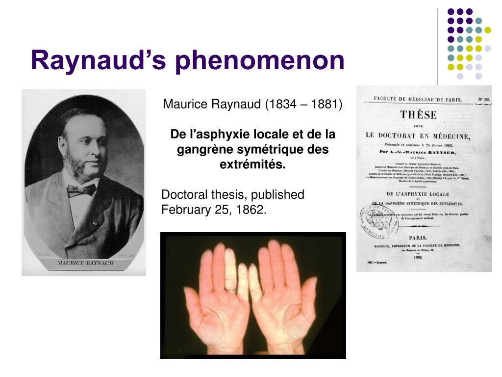 他记录了25个病例,其中一位女性的手指在寒冷或情绪激动时会突然变得像死人一样苍白,随后变成青紫色,最后又在剧痛中变红 。