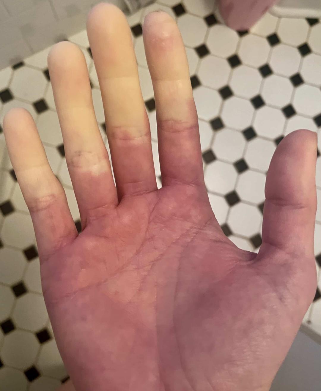 于是你的手指先是因为缺血变成死蜡般的白色,接着因为缺氧变成青紫色,最后血管重新开放,充血变成鲜艳的红色,并伴随着一种类似解冻般的刺痛感 。