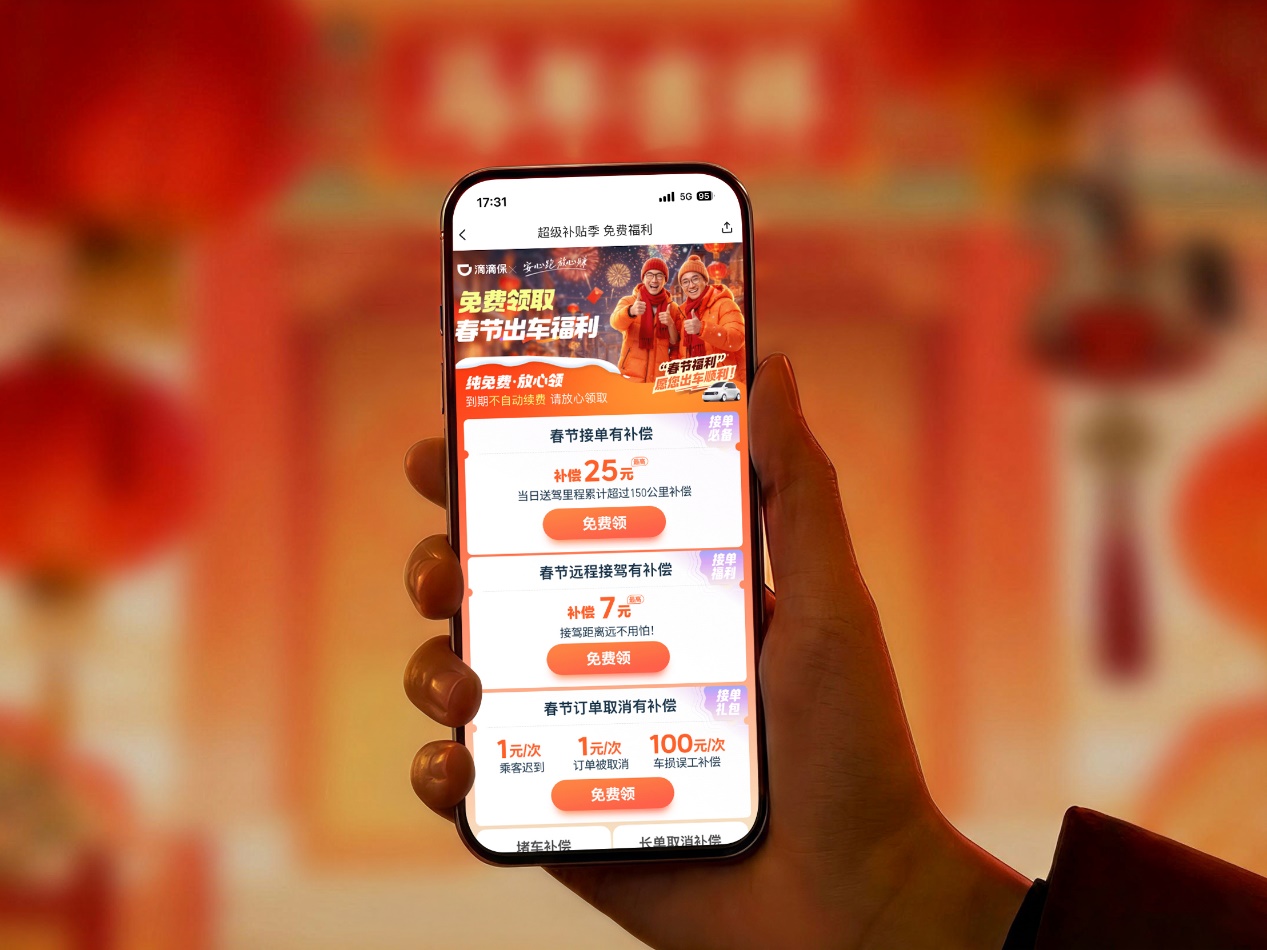 春节期间,司机师傅可在滴滴车主生活页的滴滴保内,免费领取7项春节出车福利,覆盖接单、远程接驾、订单取消、堵车、长单取消等多个出车场景。