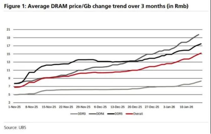 报告数据显示,汽车应用领域的DRAM价格三个月内暴涨180%,富国银行指出,DDR5现货价格较2024年平均水平高出8倍以上,DDR4价格更是高出16倍。车规级DRAM因需满足耐温、抗震、高可靠性标准,价格高于消费级产品,而汽车行业在全球DRAM市场份额不足10%,部分数据显示仅为3%,薄弱的议价能力让车企难以抵御芯片涨价压力。