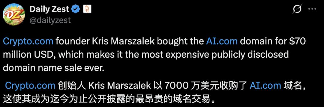 近日,Crypto.com创始人Kris Marszalek以7000万美元(约合5亿人民币)的天价买下AI.com域名,这一消息震撼了整个硅谷科技圈。
