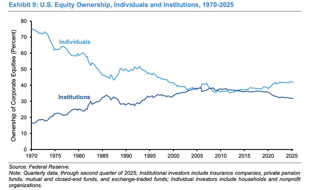 不过「明亮公司」发现,中美创始人IP的货币化路径存在差异:这既源于产业基础——中国是供应链强国,美国是金融创新强国;也与投资者结构变化有关——疫情后美国散户进场规模扩大,占比甚至超过机构。
