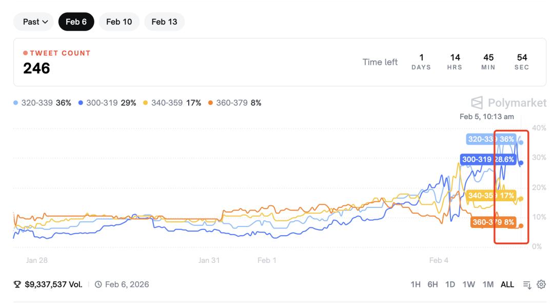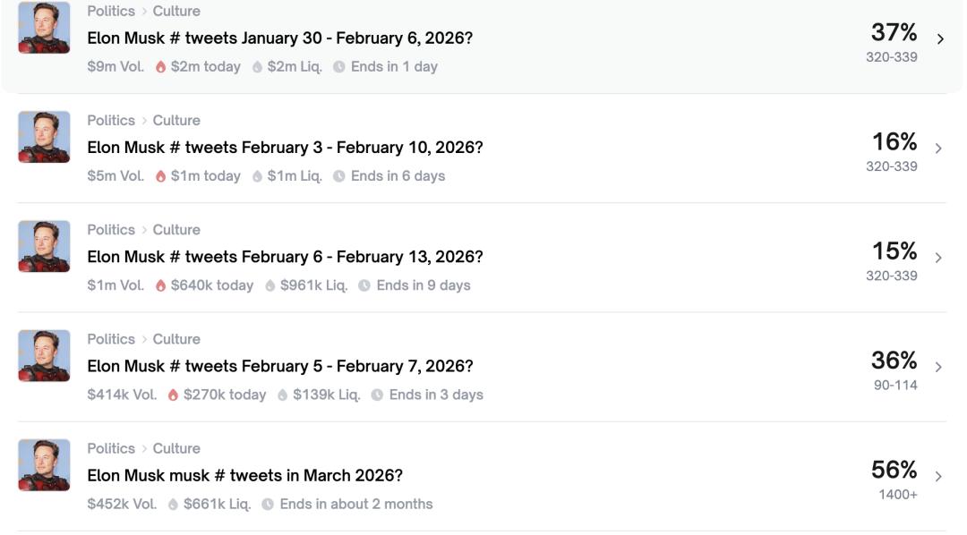 在预测市场Polymarket上,马斯克“发推数量”已成为可预测事件,用户可对其每周在X平台的发推数量进行预测下注。