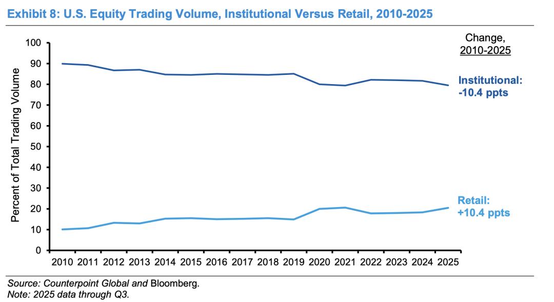 摩根士丹利《Who Is On the Other Side?》报告指出,2020年以来散户股东增速显著高于机构,背后原因包括Robinhood等免佣金券商兴起、疫情影响及投资游戏化趋势。