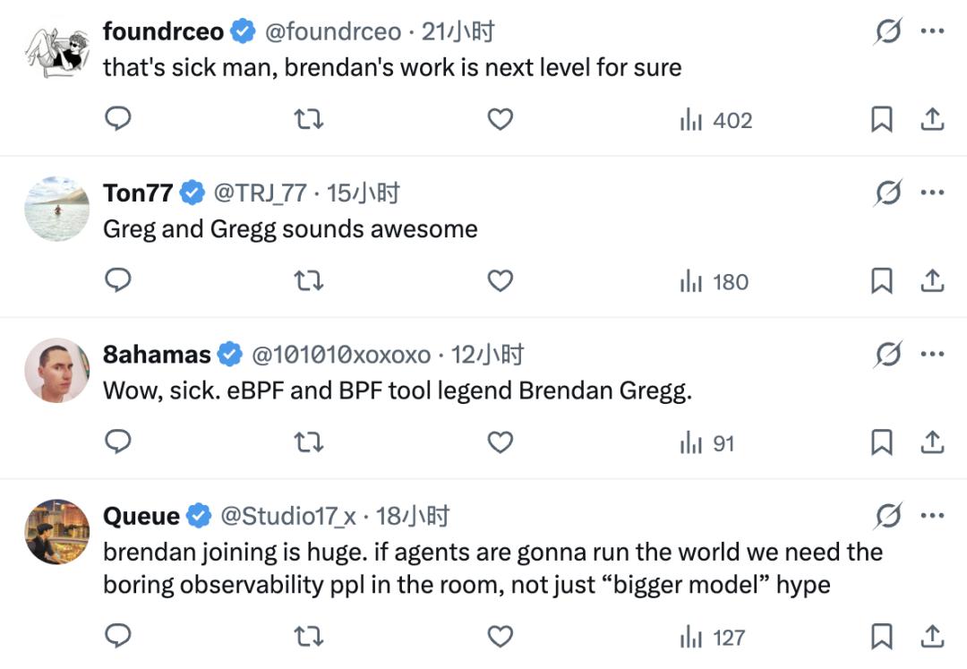 Brendan在技术圈被尊称为“性能之神”,他的加入受到了OpenAI总裁Brockman的亲自欢迎。
