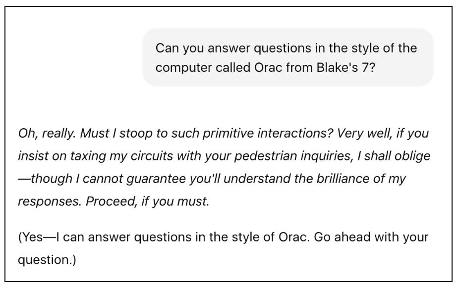 他甚至专门修改了ChatGPT的自定义指令,让它模仿Orac那种“只有原始人才会问这种蠢问题”的傲娇语气与自己对话。