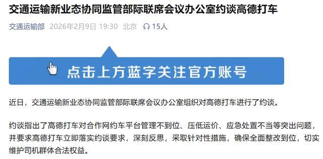 2026年2月9日,交通运输新业态协同监管部际联席会议办公室对高德打车进行约谈,明确指出其存在“对合作网约车平台管理不到位、压低运价、应急处置不当”等问题。