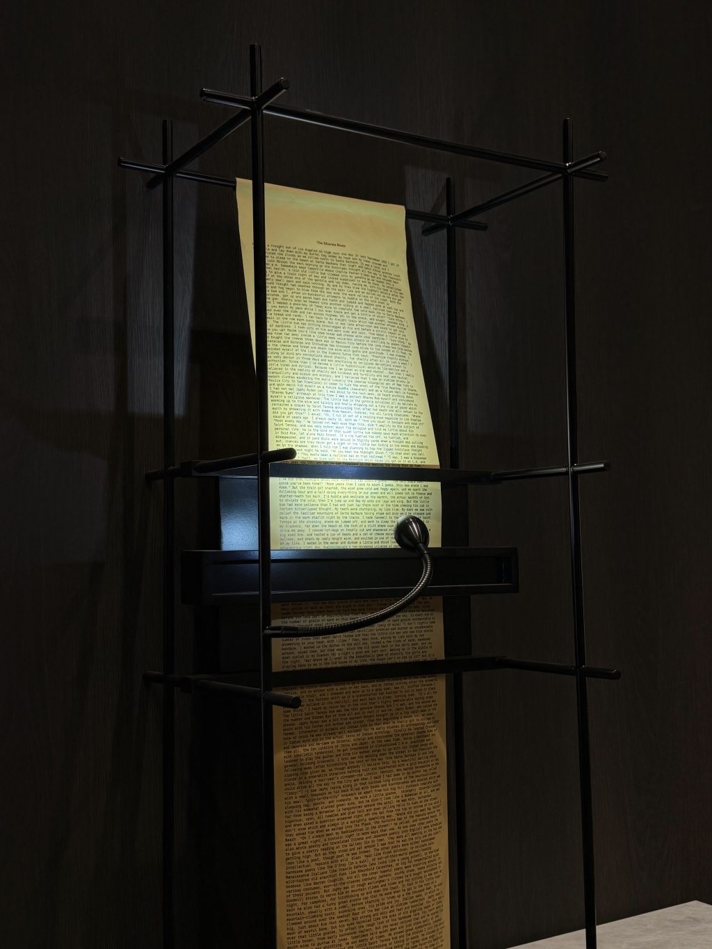 单元亮点是基于凯鲁亚克1957年《达摩流浪者》打字稿长卷的装置。当年凯鲁亚克用胶带衔接十页打字纸,制成18.6米长卷,避免换纸打断创作节奏。这种卷轴式写作保留了语言的流动性与即兴性,体现“第一念即最善念”的佛教理念,成为“垮掉的一代”自由书写精神的象征。