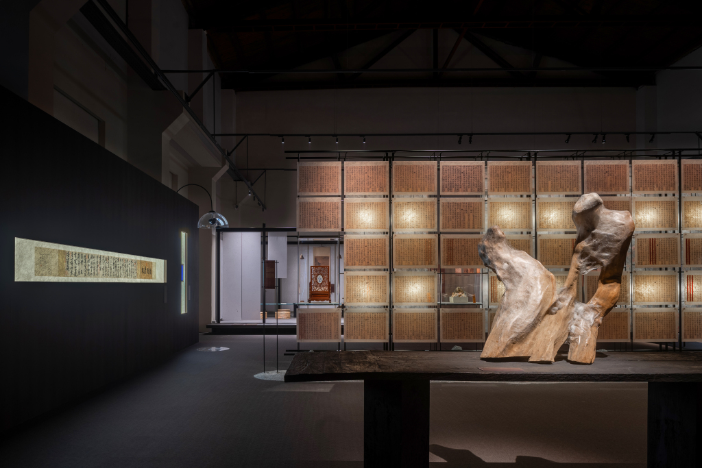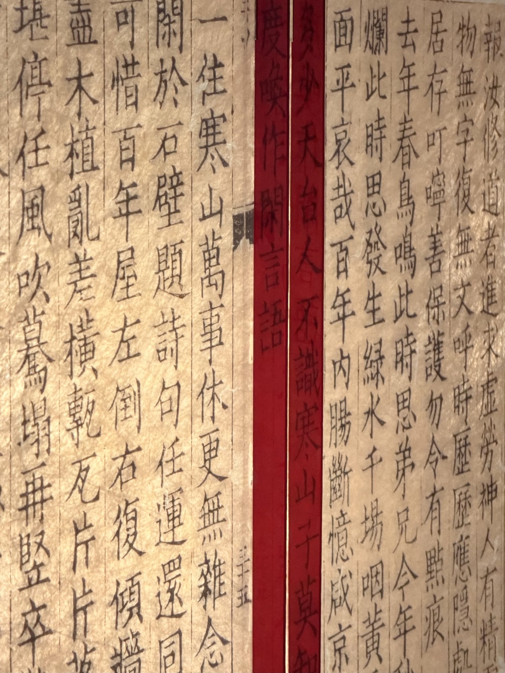 由左靖、王彦之联合策划的展览入口处,矗立着以《寒山诗集》南宋刻本为蓝本的大型装置。装置精选代表性诗句高亮呈现,引导观众循诗探人,从字里行间追溯这位隐士诗人的生平、生活与诗风。这些诗句曾远渡重洋,被译为西文启发美国“垮掉的一代”;也曾融入现代音乐,如郑飞作曲的《寒山子的诗——为三弦与民族管弦乐乐队而作》。在展览中,观众反复与这些诗句相遇,借不同媒介与语境,感受寒山诗跨越千年的文化共鸣。