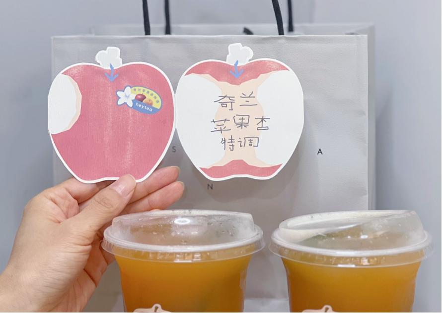 “奇兰苹果杏特调”小卡采用三折叠设计,折叠后呈“苹果”形状,展开呈现“苹果被吃掉”的三个步骤,且自带苹果香气,这种“嗅觉+视觉”的双重体验,让它被称作“夏日解暑神器”。