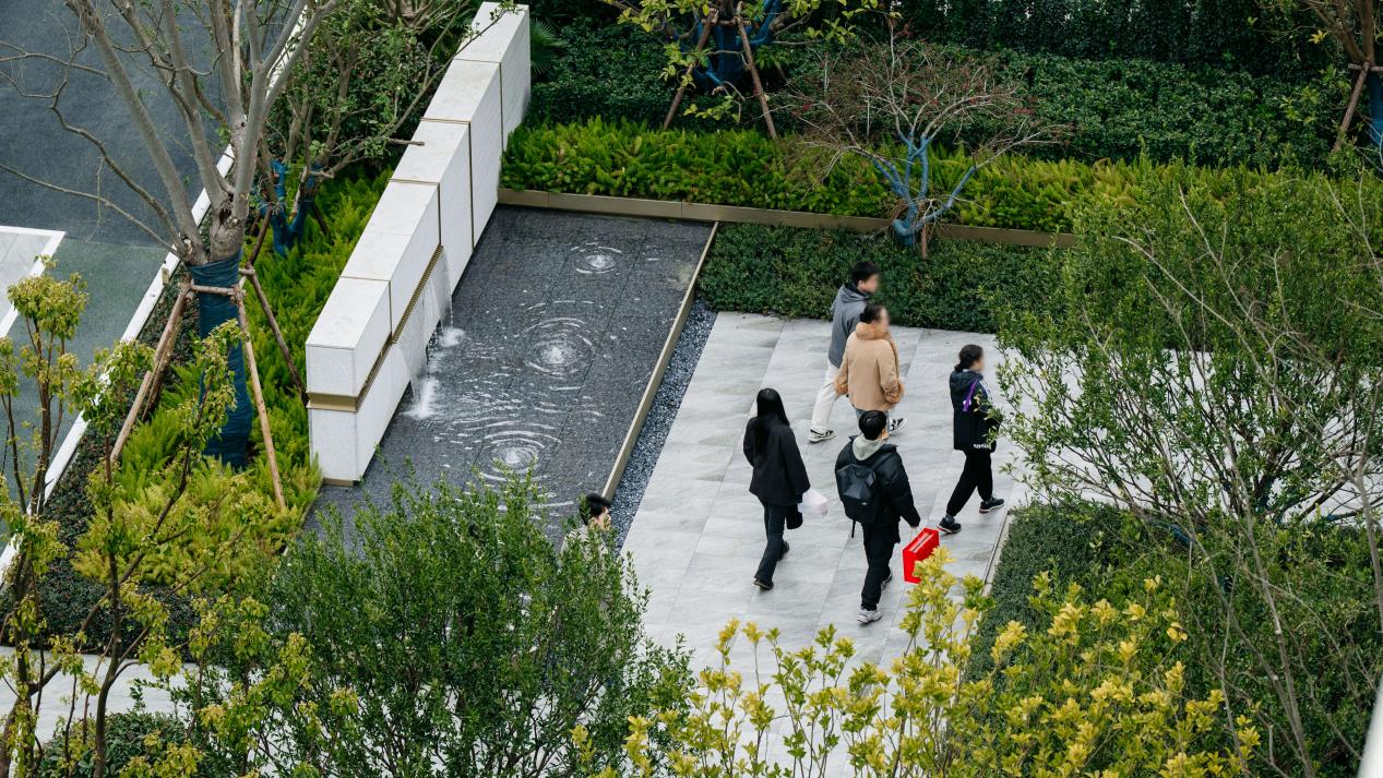 景观是另一重惊喜。设计团队围绕“都会森意的摩登花园”主题,打造一轴三带多园沉浸式园林。超100米中央景观轴如绿色脊梁,串联健康运动带、品质生活带与街区花园带。环形跑道、宅前花园、阳光草坪、儿童乐园构成“私属公园”,贯穿南北的水景节点与绿植映衬,营造仪式感归家动线,实现“景观入户”。