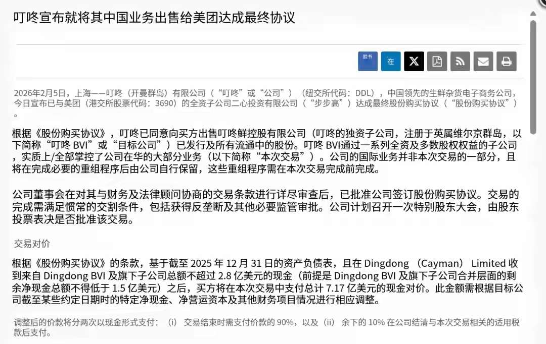 即时零售行业正迎来关键转型期,美团以7.17亿美元全资收购叮咚买菜的交易,成为推动行业格局重塑的标志性事件。这不仅是企业间的商业整合,更预示着即时零售从早期规模扩张的1.0阶段,迈向以资源协同、效率升级为核心的2.0新阶段。
