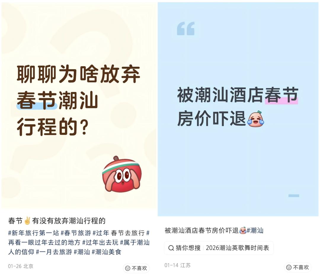 另据同程旅行发布的《2026年春节旅行趋势报告》,春节酒店预订热度方面,潮汕地区呈现暴涨态势,揭阳酒店预订热度同比提升337%。