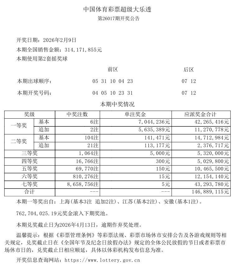 2月9日,超级大乐透第26017期开奖结果揭晓。前区号码开出04、05、10、23、31;后区号码为07、12。本期全国彩票销售额达3.14亿元,为国家筹集彩票公益金1.13亿元。