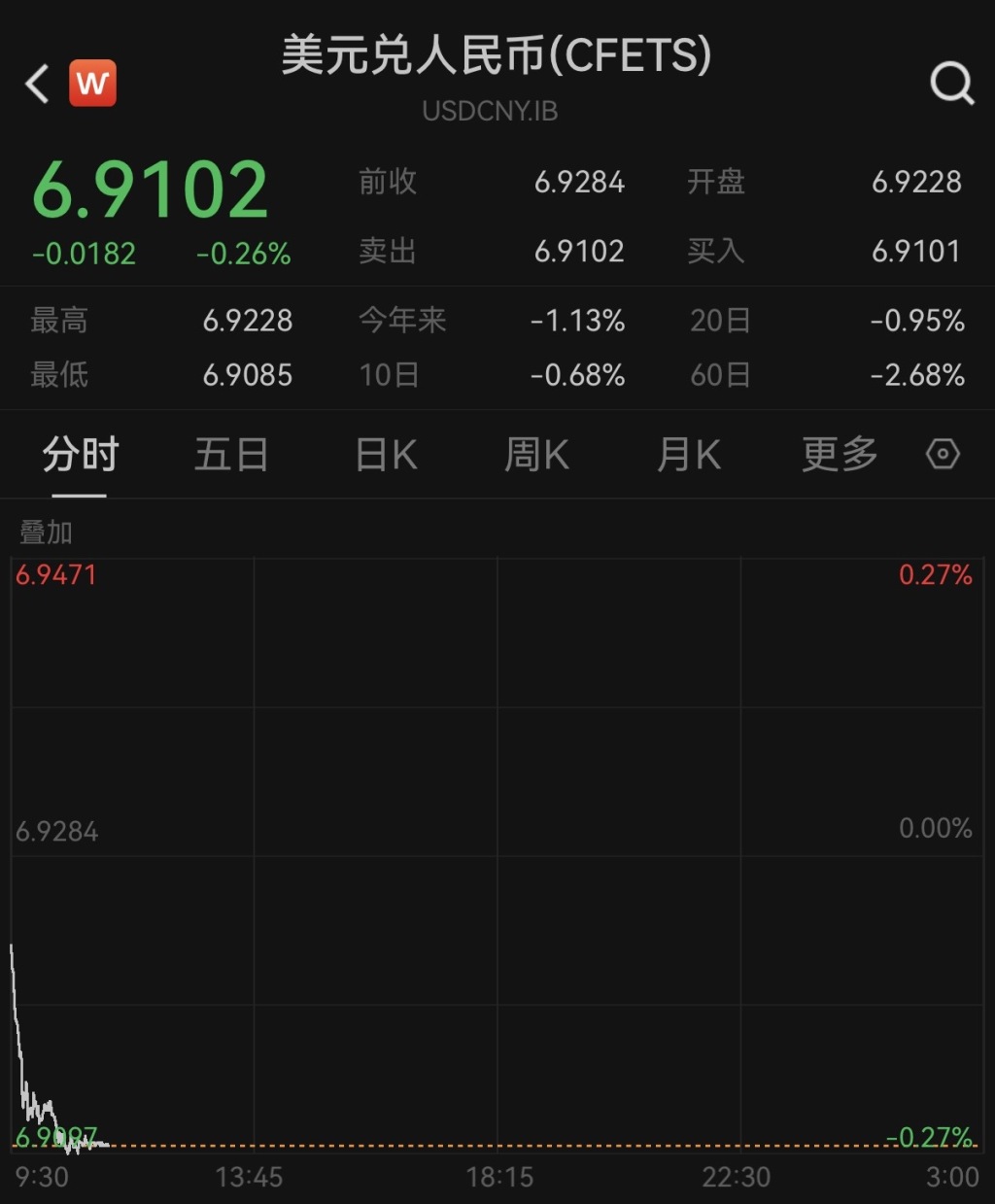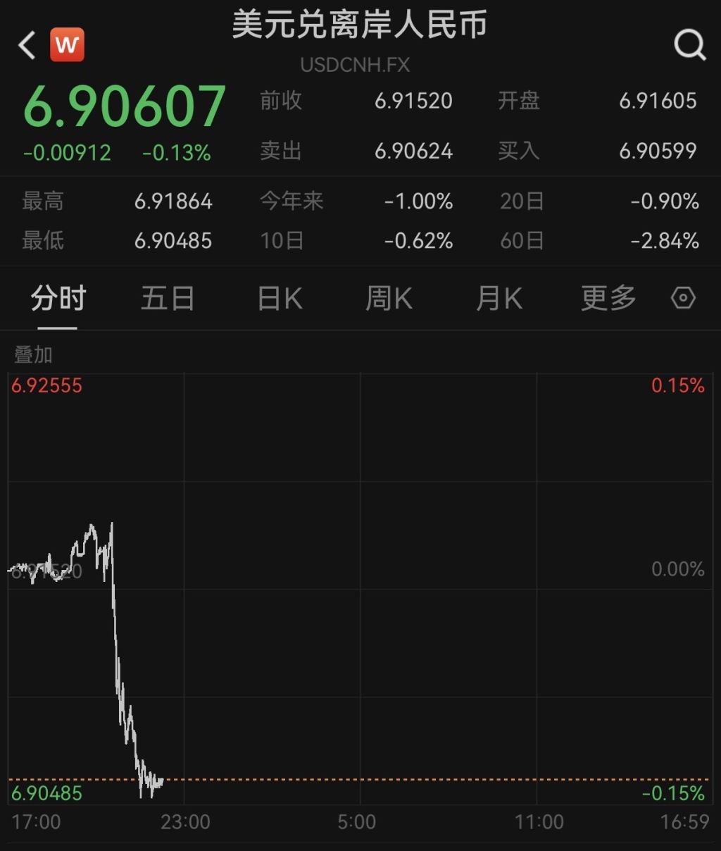 在岸与离岸人民币对美元汇率同步升破6.91关口