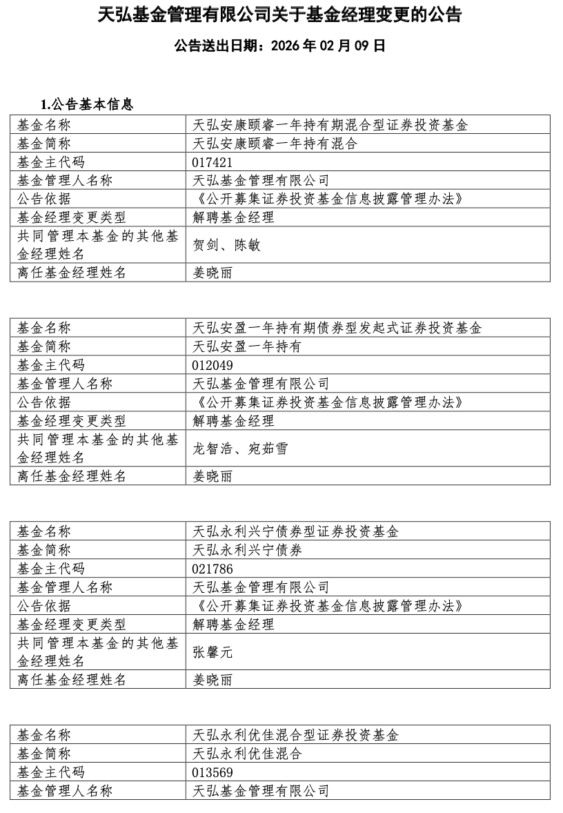 2月9日,天弘基金发布公告,宣布姜晓丽于当日卸任其管理的全部10只基金产品,至此她不再担任该公司任何基金的基金经理职务,且已提交离职申请。