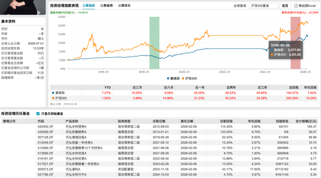 以她管理的代表性产品天弘永利债券B为例,基金定期报告显示,自2012年8月姜晓丽开始管理该产品以来的13个完整年度里,有11年取得正收益;截至2025年末,该基金近18年的累计收益率达167.12%,超越业绩比较基准60.85个百分点。