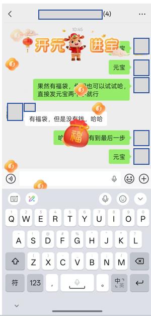 见实测试后发现,在微信私聊或群聊界面发送“元宝”,屏幕上方会掉落福袋,同时弹出“元宝祝你开元进宝”的提示语。