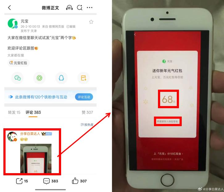 今日凌晨,元宝引导用户在微信聊天窗口发送“元宝”二字。有网友在评论区晒出领到68元的截图,显示该金额“将直接存入微信零钱”。