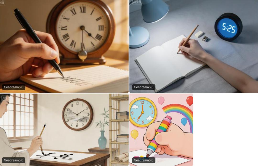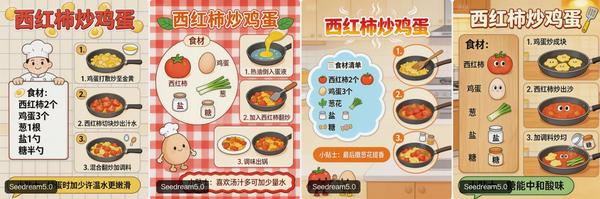 对比测试中,“左手写字+5:25时钟”的高难度提示词让Seedream 5.0与Nano Banana Pro均未完全达标,但Seedream 5.0生成的图片风格更多样(现代、古风、卡通等);生成“西红柿炒鸡蛋卡通菜谱”时,Seedream 5.0的排版和设计美观度优于4.5版本。