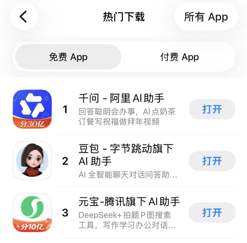 不过,红包大战的流量效应显著。腾讯元宝曾登顶苹果应用商店免费榜,目前苹果商店免费APP前三甲已被千问、豆包、元宝包揽,AI应用强势霸榜。