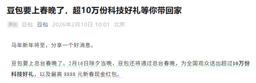 2月10日,豆包官宣“登陆春晚”,将通过这一国民级平台送出超10万份科技礼品及最高8888元的现金红包。