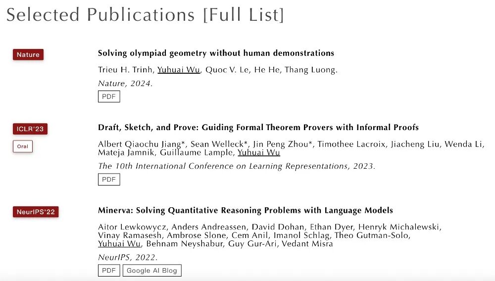 吴宇怀的主要研究方向是构建具有推理能力的机器。在校期间,他主导或深度参与了多个知名项目,比如自训练增强推理模型STAR、定理证明器Alpha Geometry以及语言模型Minerva,这些项目的目标是打造一个自动化的AI“数学家”。
