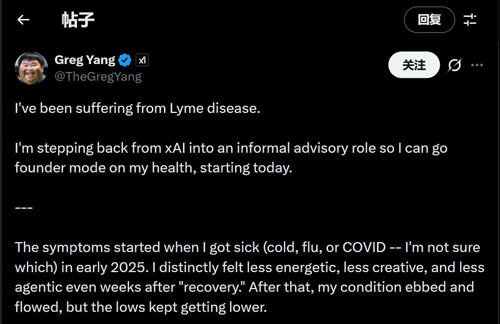 杨格发文表示,自己被诊断出患有莱姆病(Lyme disease),并透露可能很早就患病了,但在全力投入xAI创建、长期透支身体、导致免疫系统受损后,症状才开始显现。