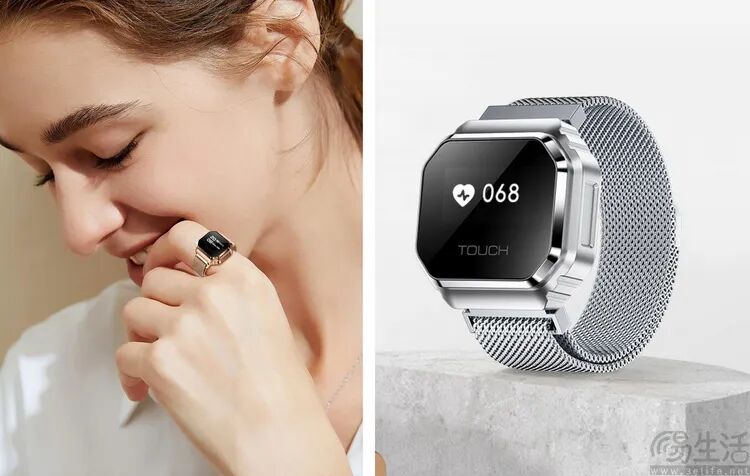 这是一款“二合一智能戒指”,其结构和外观更像迷你智能手表,配备小触摸屏,可通过更换表带切换戒指和手环佩戴方式。