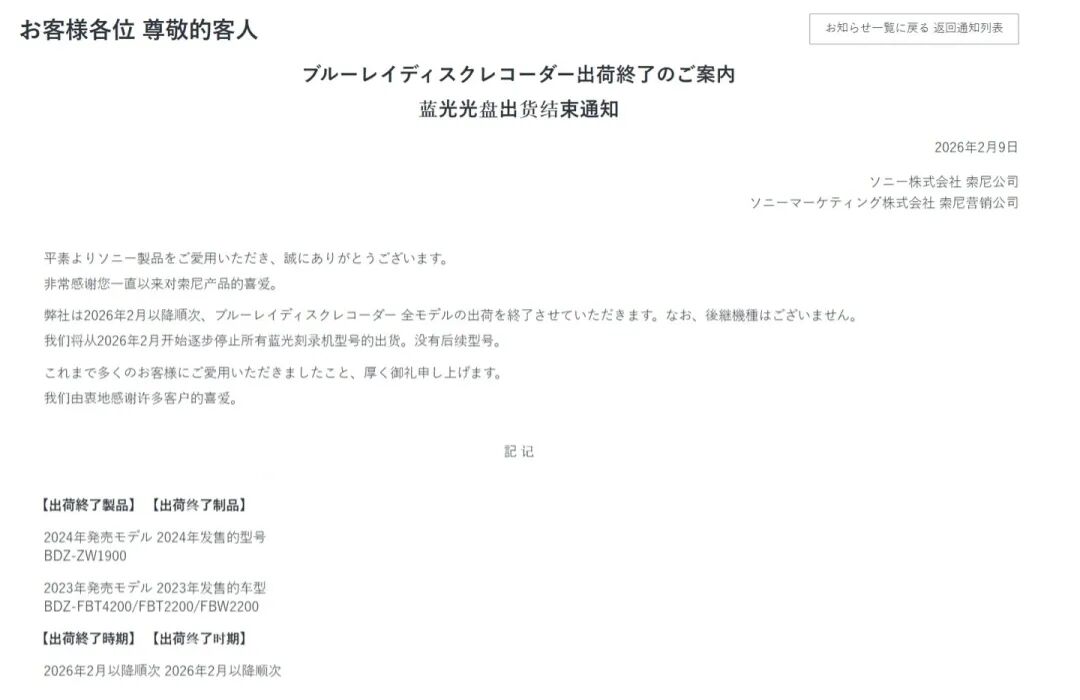 界面新闻了解到,当地时间2月9日,作为蓝光光盘标准核心开创者的索尼,在其官方网站发布公告,宣布从2月起逐步停止旗下所有蓝光录像机产品的出货,并且明确表示“无后续机型规划”,这标志着这家科技巨头彻底退出家用蓝光录像机硬件市场。