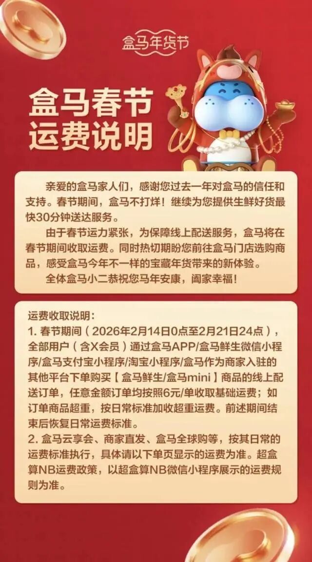盒马发布通知,春节期间(2026年2月14日0点至2月21日24点),所有用户(包括X会员)通过盒马App、盒马鲜生微信小程序、盒马支付宝小程序、淘宝小程序及盒马入驻的其他平台下单购买【盒马鲜生/盒马mini】商品的线上配送订单,无论金额多少均按6元/单收取基础运费;若订单商品超重,将按日常标准加收超重运费。此期间结束后恢复日常运费标准。