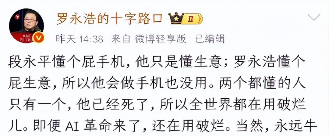 罗永浩对此不认同。2月7日,他转发微博评论:“段永平懂个屁手机,他只是懂生意;罗永浩懂个屁生意,所以会做手机也没用。两个都懂的人只有一个,他已经死了,所以全世界都在用破烂儿。”这里的“两个都懂的人”被认为是指乔布斯。