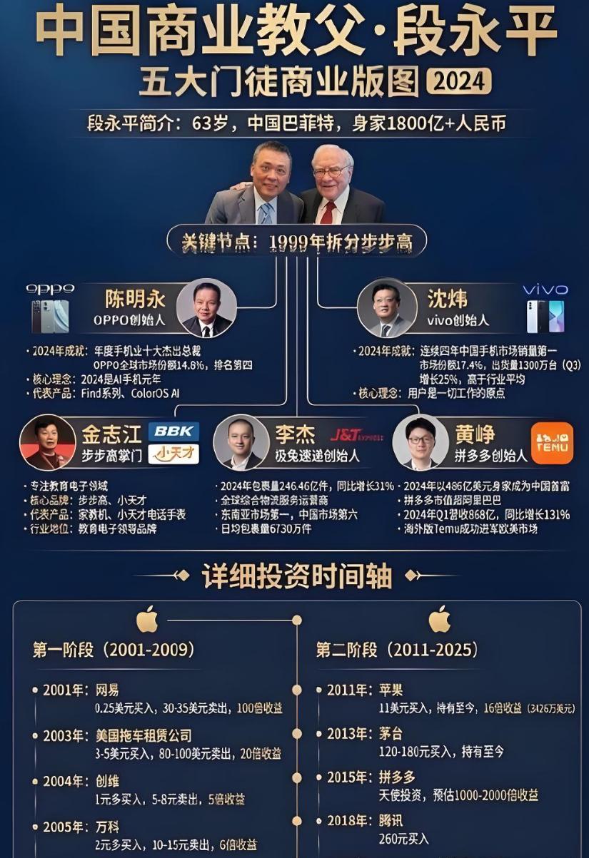 与罗永浩的高调不同,段永平的商业版图更沉稳深谋。他毕业于浙江大学无线电系,获人大硕士学位,从化市学习机到步步高,再拆分出OPPO、vivo、小天才等品牌,逐步构建庞大商业与技术版图。
