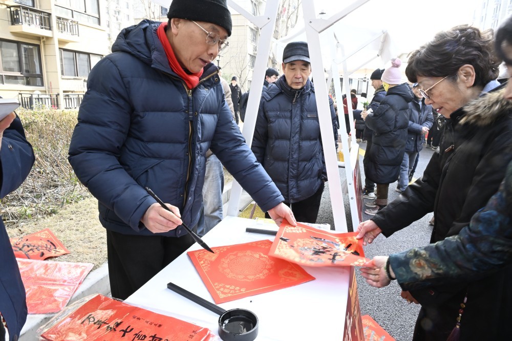 2月11日,上海市静安区彭浦新村街道彭一小区,居民们现场书写春联与福字。 静安区 供图