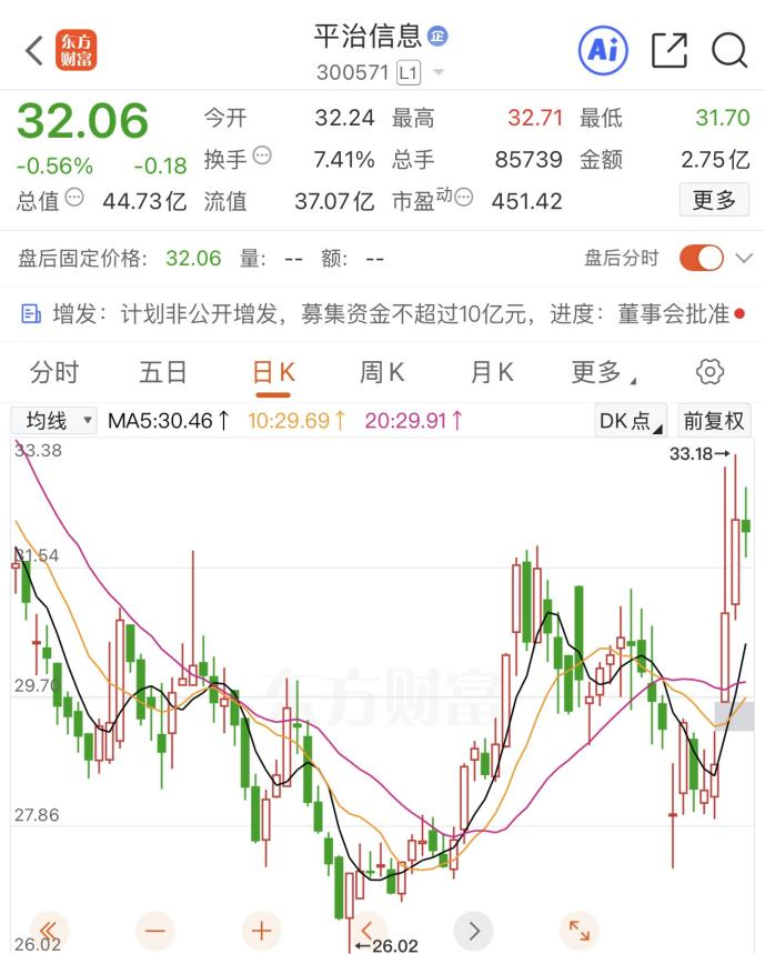 截至2月11日收盘,平治信息股价为32.06元/股,最新市值44.73亿元。