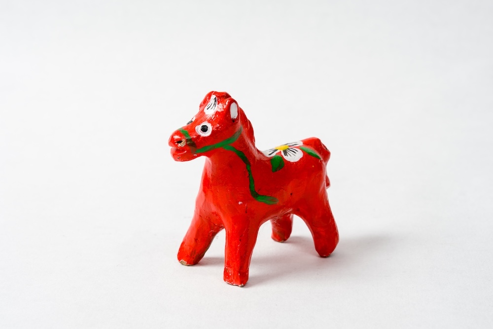 与玩具相关的是各地民间艺术形态。胶东、晋南、关中等地的剪纸马,凤翔泥塑中夸张鲜艳的马形象,服务于节庆、装饰与祝愿。和学院写实传统不同,这些民艺作品不追求比例准确,强调形象明确与象征有效:头大身小、线条简化、红绿对比强烈,让马成为易识别、复制和传播的视觉符号。